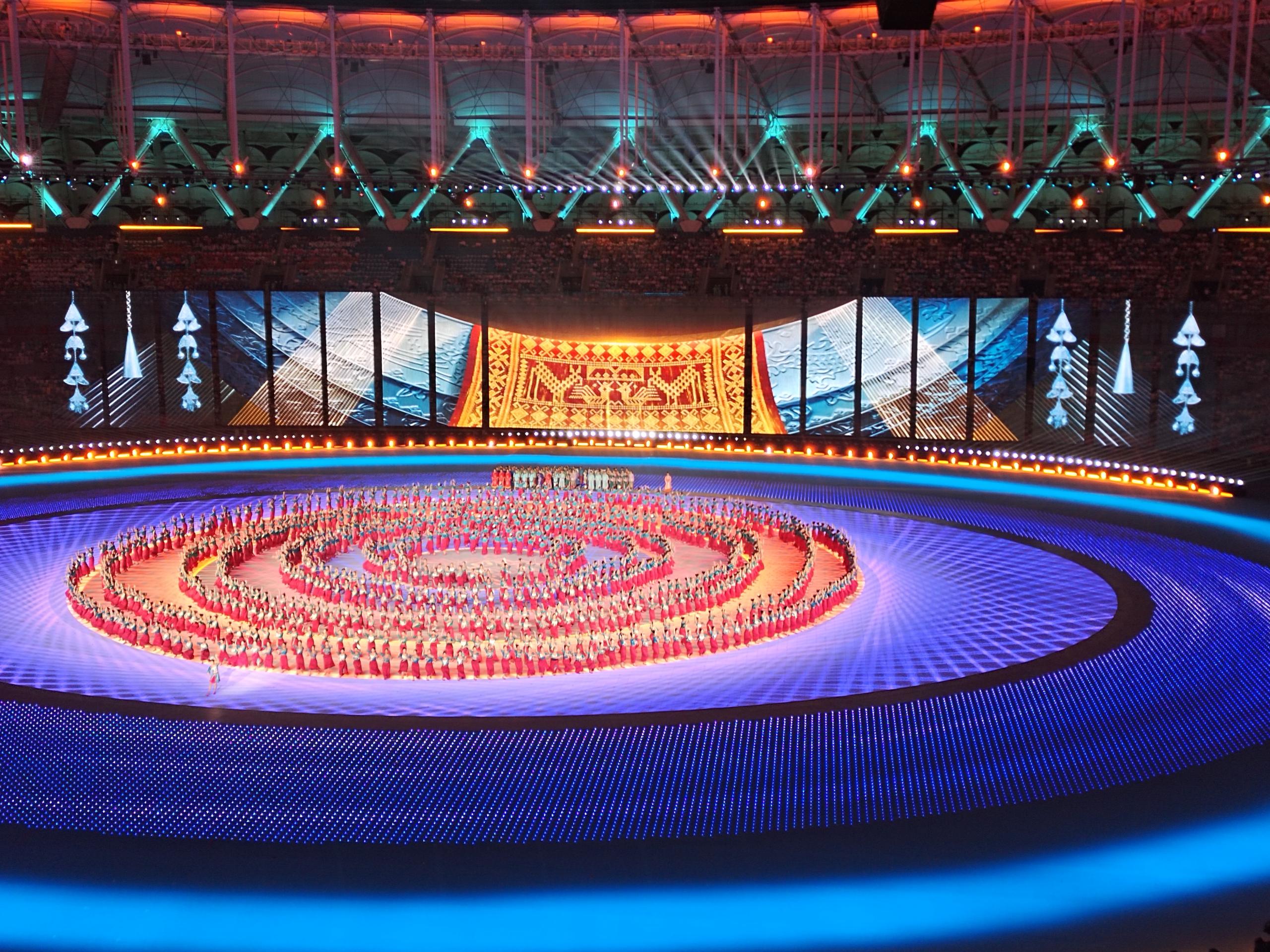 圍繞「中華民族大家庭,同心圓夢新征程」的主題,開幕式巧妙地將「同心圓」概念融入舞美設(shè)計、節(jié)目編排及主火炬設(shè)計中。